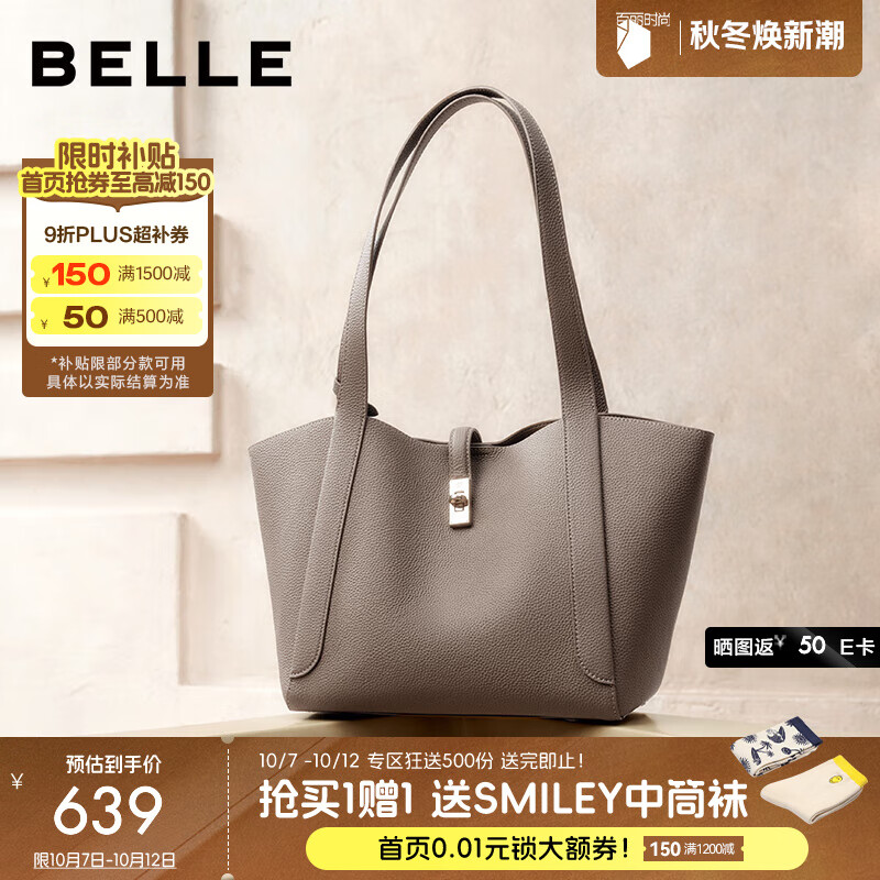 百丽包女25秋新商场同款质感通勤牛皮革大容量单肩托特包BL863DX5 灰色 F