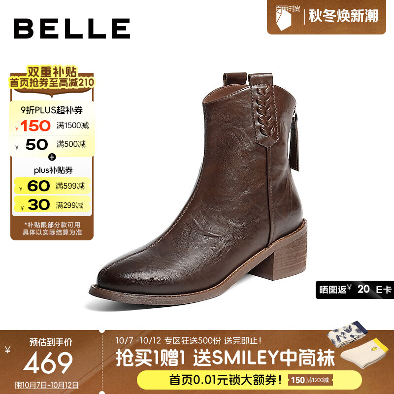 百丽(Belle)简约利落时装靴女2025冬新气质高跟通勤时装短靴B2879DD5 棕色 40