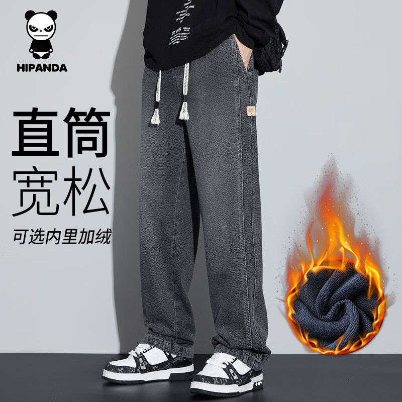 HIPANDA你好熊猫牛仔裤男2025秋冬休闲经典水洗保暖加绒直筒牛仔长裤子男 黑灰-加绒款 XL