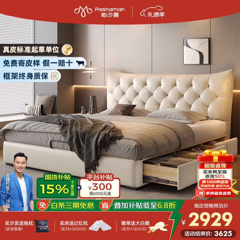 帕沙曼国货补贴真皮床奶油风泡芙主卧双人床现代简约床2025年新款7023CP 【榉木】单床+TR1801#床头柜*2 框架结构1800mm*2000mm