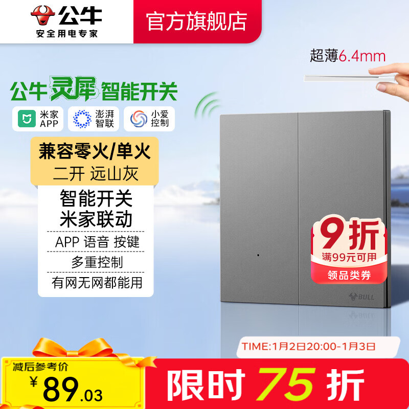公牛(BULL)灵犀超薄智能开关面板 接入米家系统 支持小爱语音控制远山灰 【智能二开(单零火兼容版)】