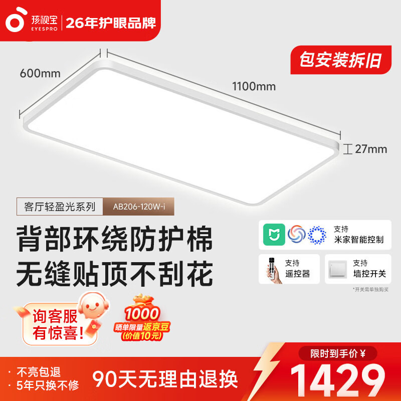 孩视宝轻盈光·全光谱护眼吸顶灯智能2.7cm超薄无缝客厅卧室书房led灯具 120W 35㎡内适用 12360lm 【轻盈光客厅】暖白-智能款