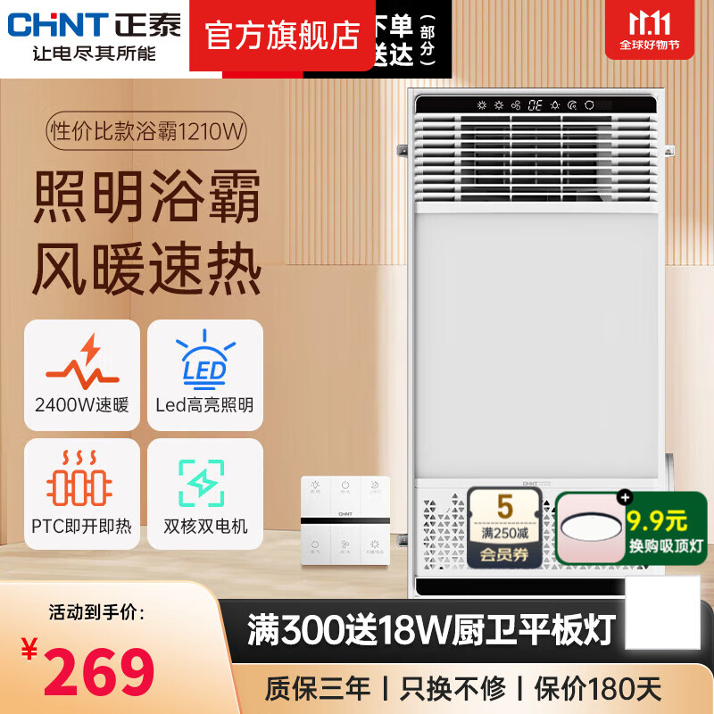 正泰(CHNT)浴霸风暖浴室取暖器 集成吊顶嵌入式暖风机卫生间大功率吹风换气 【数显款】双电机2400W+照明+换气+数显 风暖浴霸