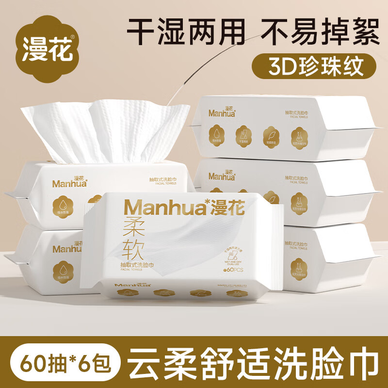 漫花一次性洗脸巾加厚擦脸巾洁面巾家用绵柔巾 云柔洗脸柔巾60抽*6包