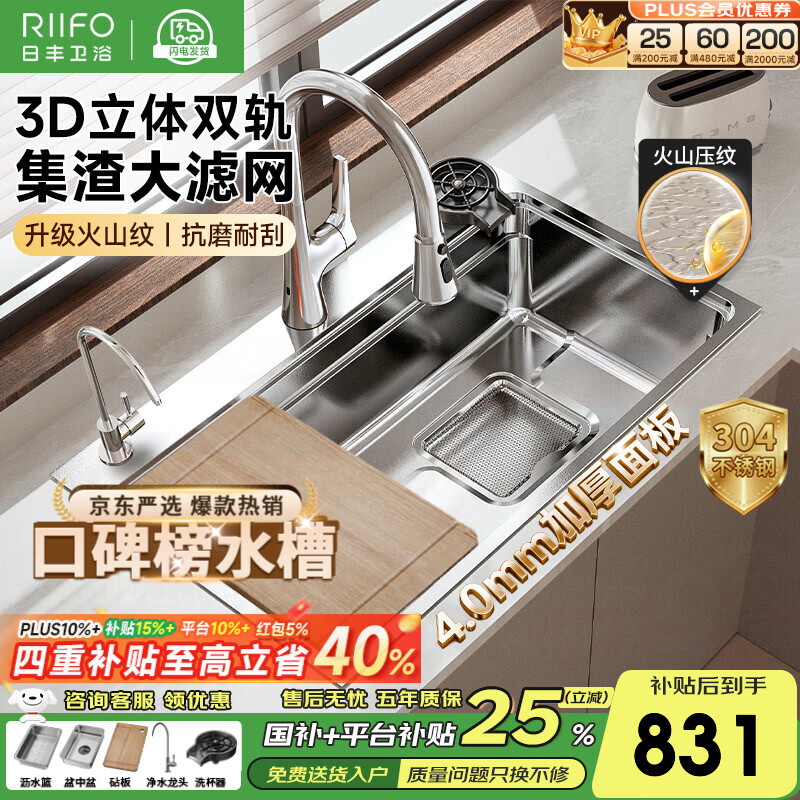 日丰厨神火山压纹纳米水槽大单槽洗菜盆厨房水槽家用加厚304不锈钢 「双重加厚|弹跳过滤」76x46|亮银冰柱水|送304盆中盆