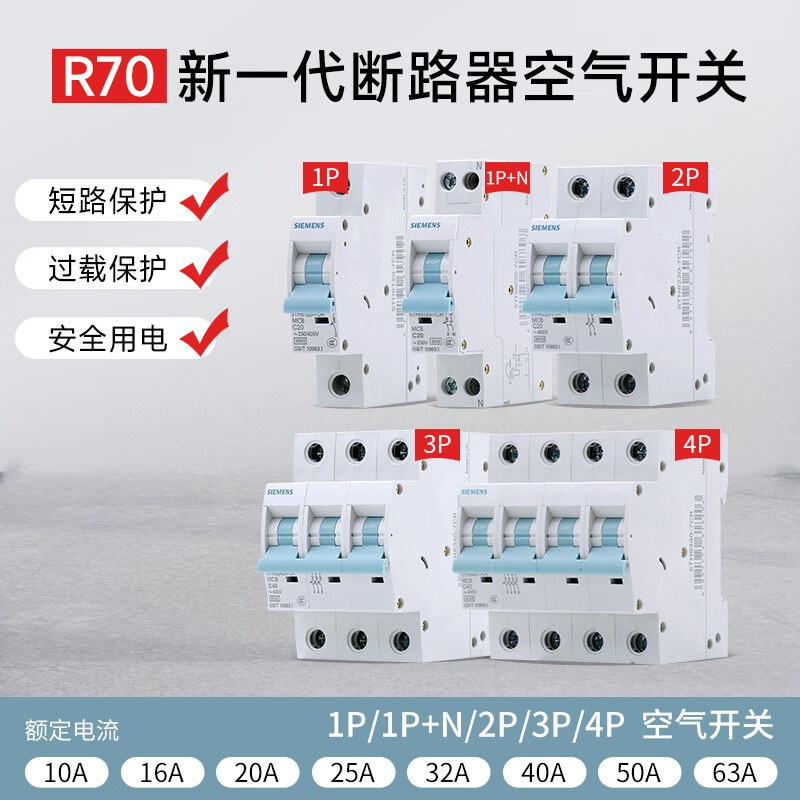 西门子(SIEMENS)新款西筑R70系列空气开关小尺寸断路器1P2P家用10~63A安全开关 2P 40A