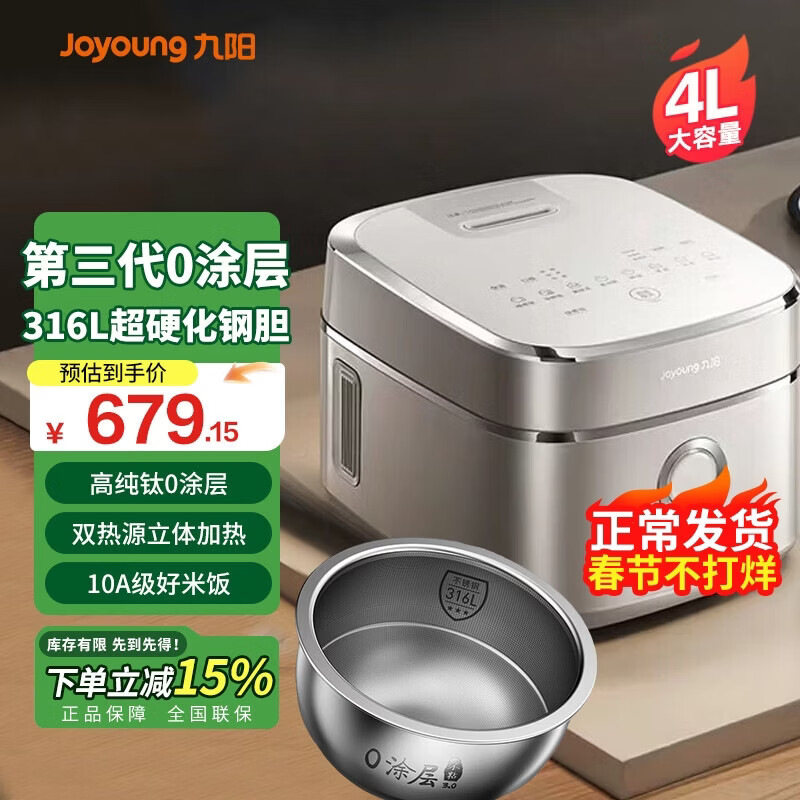 九阳(Joyoung)【升级有钛】不粘0涂层4L家用3-4人无涂层IH电饭煲电饭锅不锈钢内胆远红外多功能 沙丘灰 4L