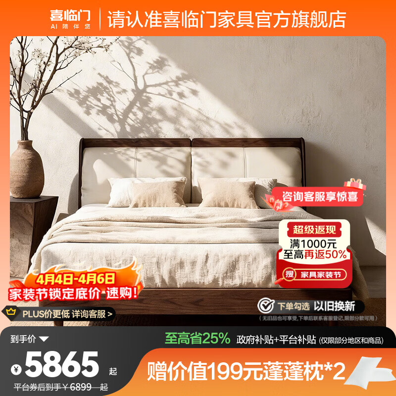 喜临门实木床黑胡桃木简约双人床主卧大床真皮实木软包床 胡桃 松玉白+漾pura床垫 1.8*2米