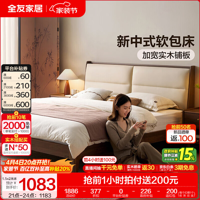 全友家居新中式实木软包床家用主卧室实木框架皮艺软包齐边双人大床 【黑胡桃木风 | 米白色软包】 1.5米x2米 单床