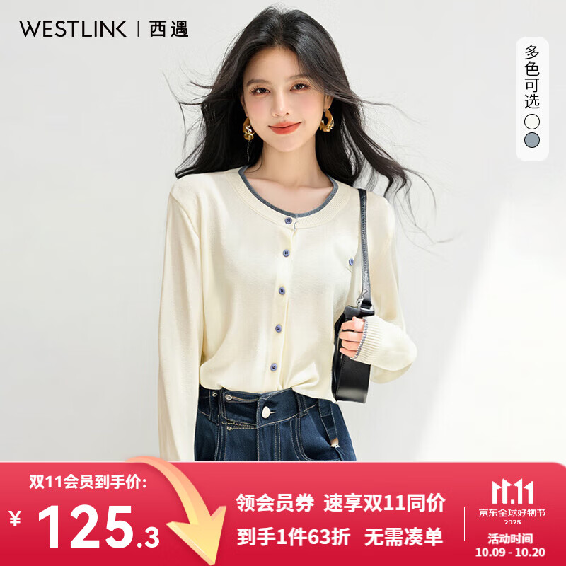 西遇(Westlink)西遇假两件针织开衫女2025年秋季新款撞色圆领慵懒宽松毛衣外套 米白色 (预售15天) M (160)