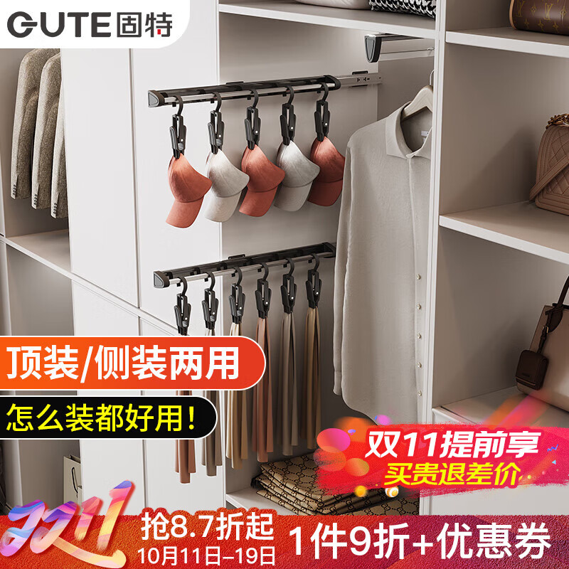 固特(GUTE)裤架抽拉伸缩架衣柜裤挂滑轨多功能收纳挂衣杆晾衣架神器 顶/侧两用款(柜深≥40.5)黑色