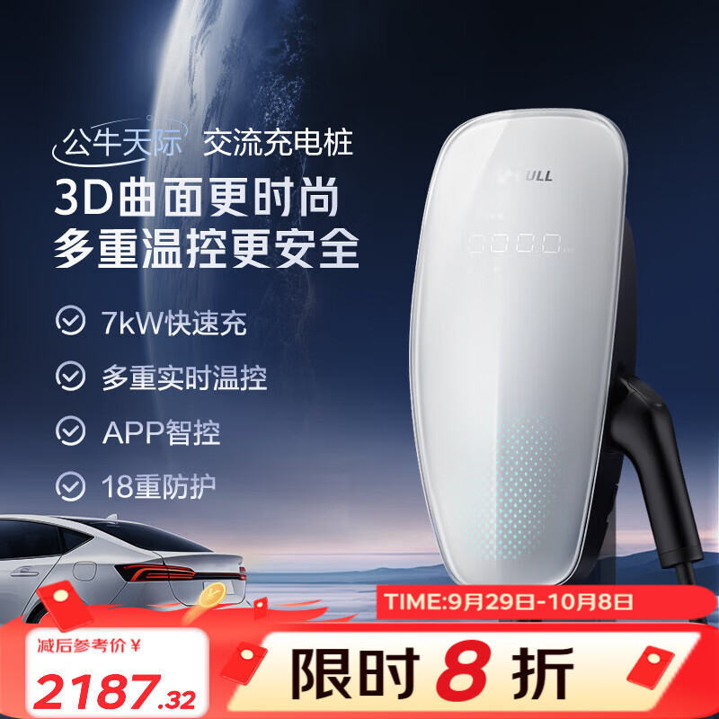 公牛(BULL)充电桩家用新能源汽车交流适配于小米su7汽车特斯拉比亚迪问界小鹏蔚来 7KW天际款 【7KW白色智联款】0米包安装