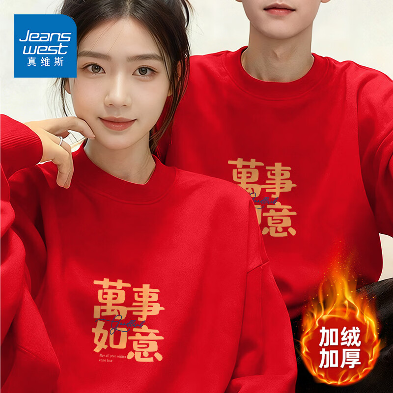 真维斯(Jeanswest)酒红色圆领卫衣男女款上衣2026马年本命年加绒保暖新年情侣款外套 加绒 红色 万事如如意 S