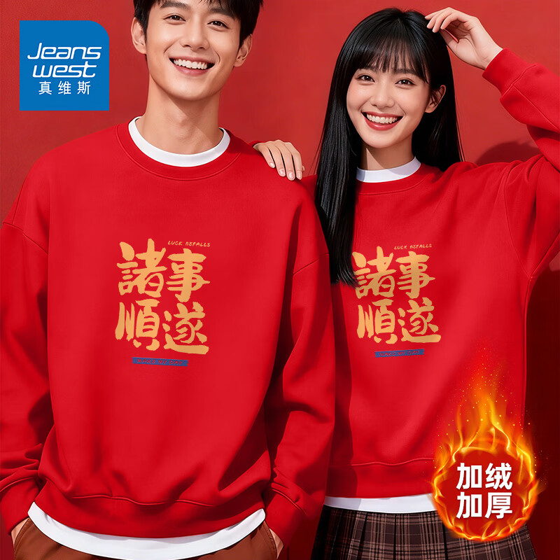 真维斯(Jeanswest)2026马年本命年衣服圆领卫衣男女款加绒秋冬新款国潮新年红色外套 加绒 红色 繁花世界 S