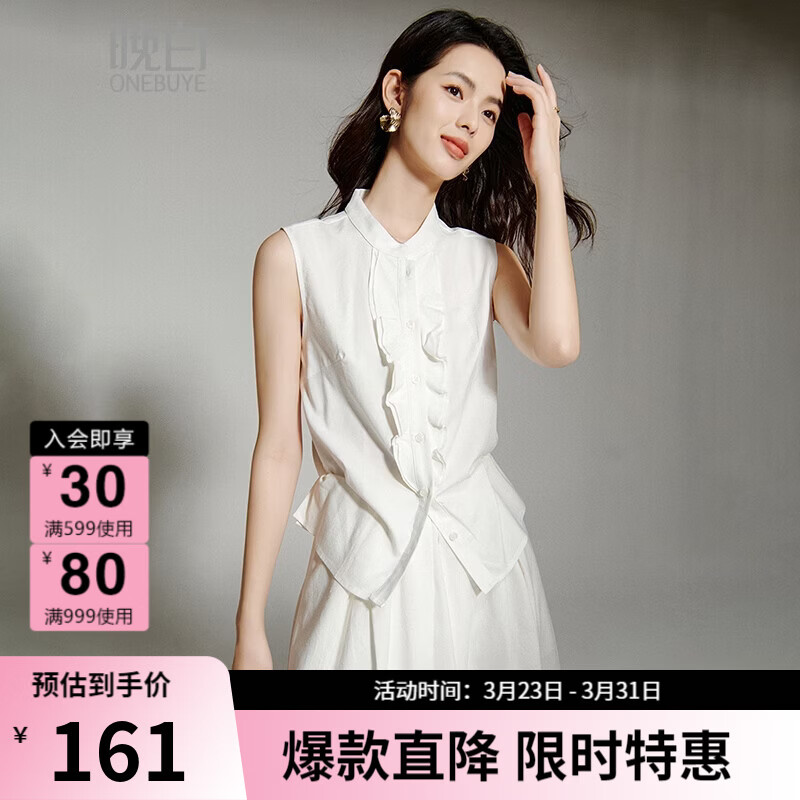 晚白【新品】2026年春款经典简洁立领棉麻上衣亲肤透气舒适无袖衬衫女 白色 S
