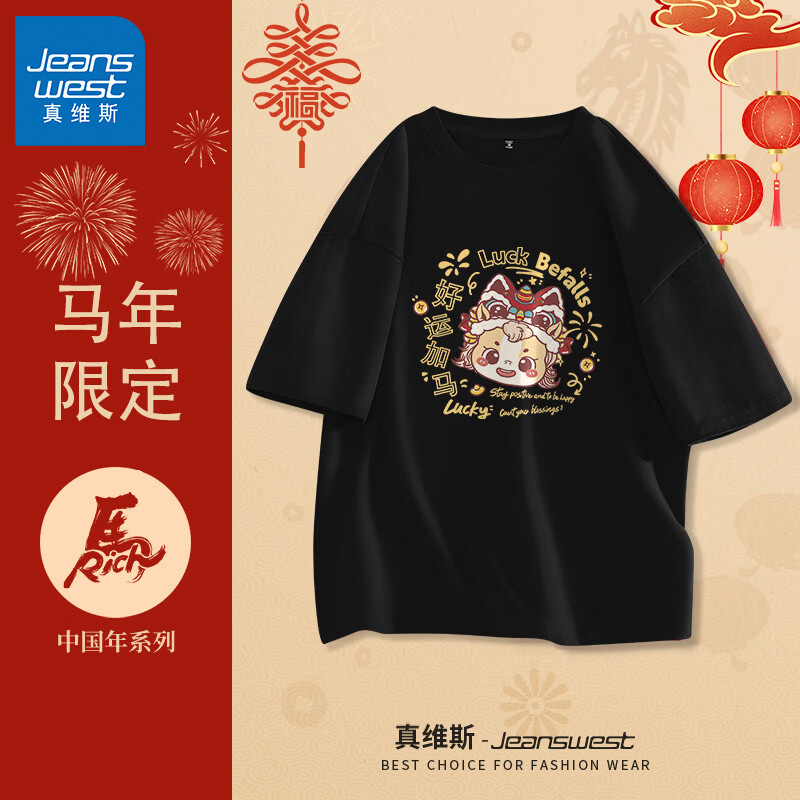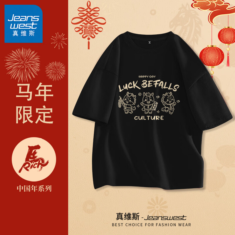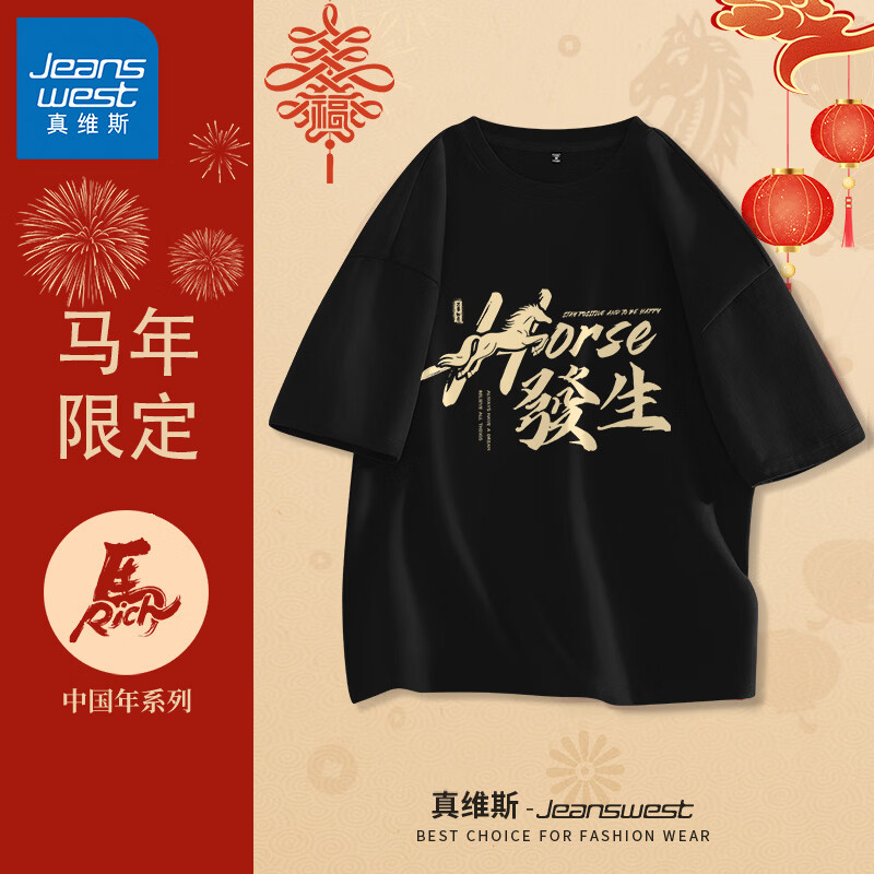 真维斯(Jeanswest)红色短袖t恤男女款纯棉重磅2026本命年衣服男士马年新年喜庆上衣 黑色 好运加马 2XL