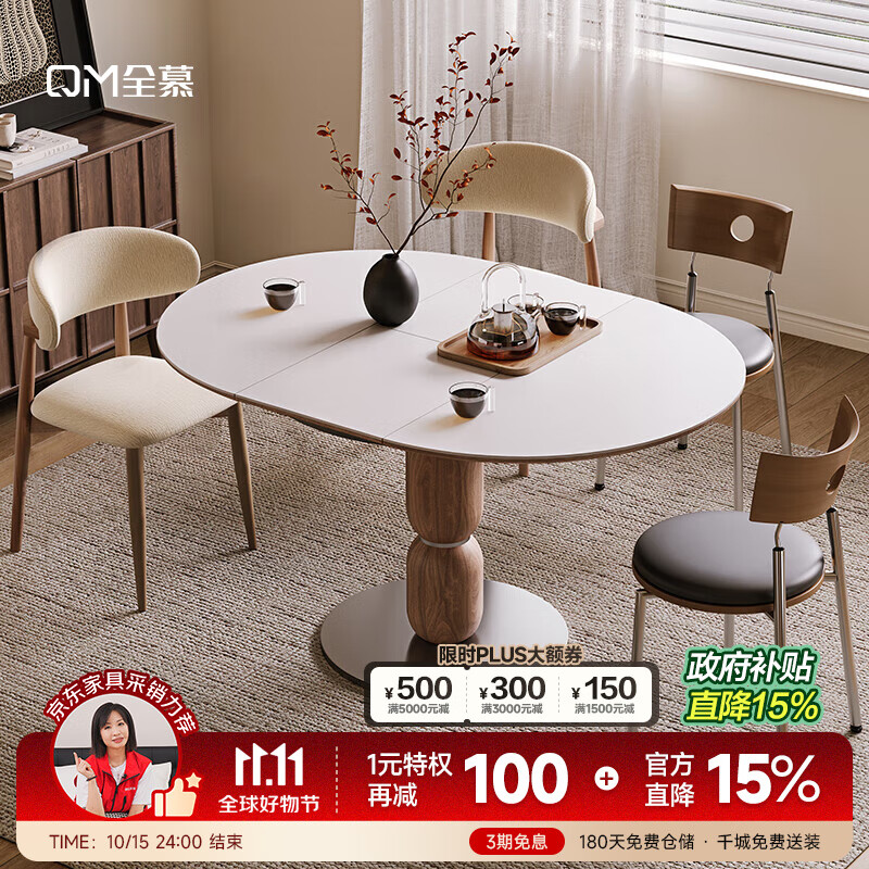 全慕(QUANMU)实木餐桌椅组合中古风高级感折叠可变伸缩小户型家用吃饭岩板圆桌 0.9米原创款圆变长桌