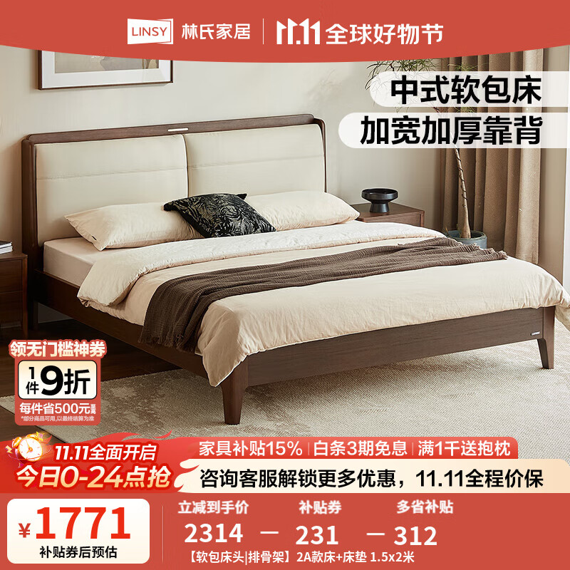 林氏家居大床新中式主卧1米8双人床实木排骨架软包床佛山家具枫糖系列RC2A 【软包床头|排骨架】2A款床+床垫 1.8x2米