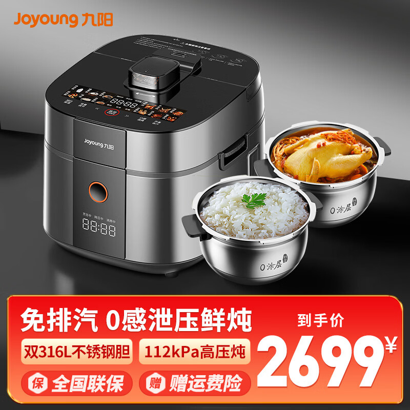 九阳电压力锅免排气 0涂层316L内胆双胆 智能预约家用多功能百千帕压力煲高压锅 远航灰 5L 【免排汽/10A沸腾好汤】
