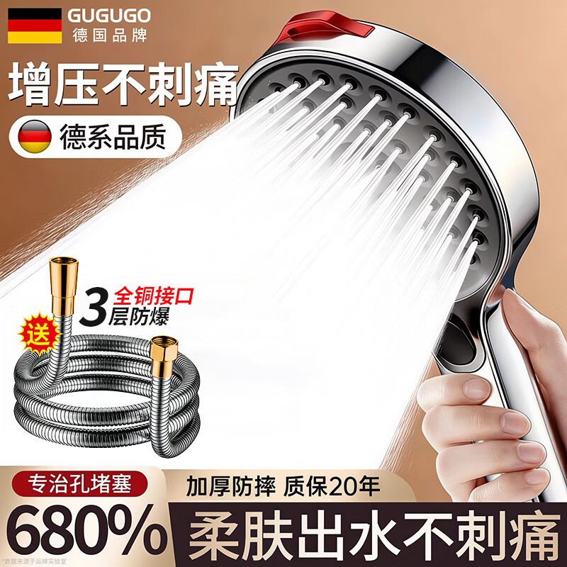 GuGuGo【德国】增压花洒喷头超强高压大出水浴室淋浴套装带软管除垢自洁 【星光银】除垢自洁花洒+1.5米软管 三档漩涡增压丨享受六星级酒店沐浴体验