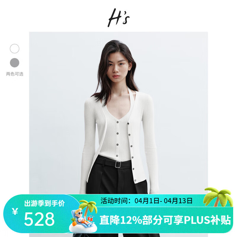 H's灰色针织开衫女26年春季新款高级设计感V领两件式修身内搭上衣 本白(两件套) M