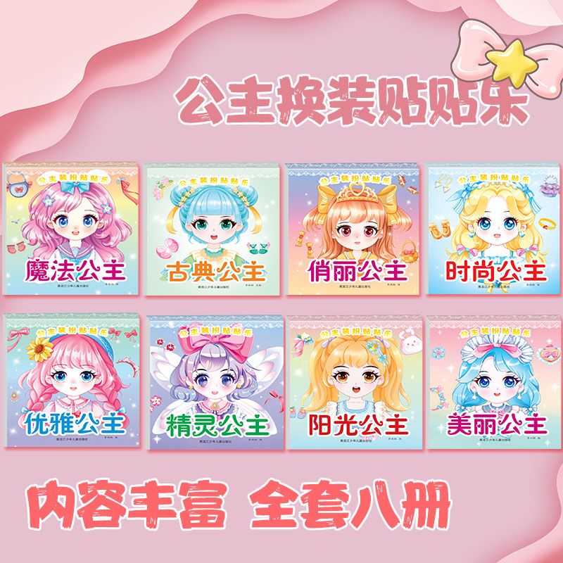 公主换装贴纸书时尚女孩换衣服趣味粘贴贴画书3-6岁儿童动脑益智力玩具卡通涂色书幼儿童换装秀专注力 【全套8本】公主换装贴纸书