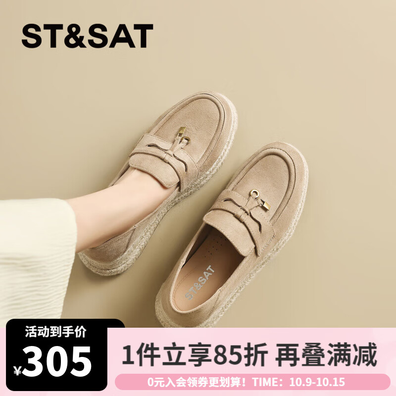 星期六(St&Sat)轻奢复古百搭乐福鞋编织鞋底一脚蹬袋鼠鞋单鞋女鞋子JXSSD3111WLF 杏色 39