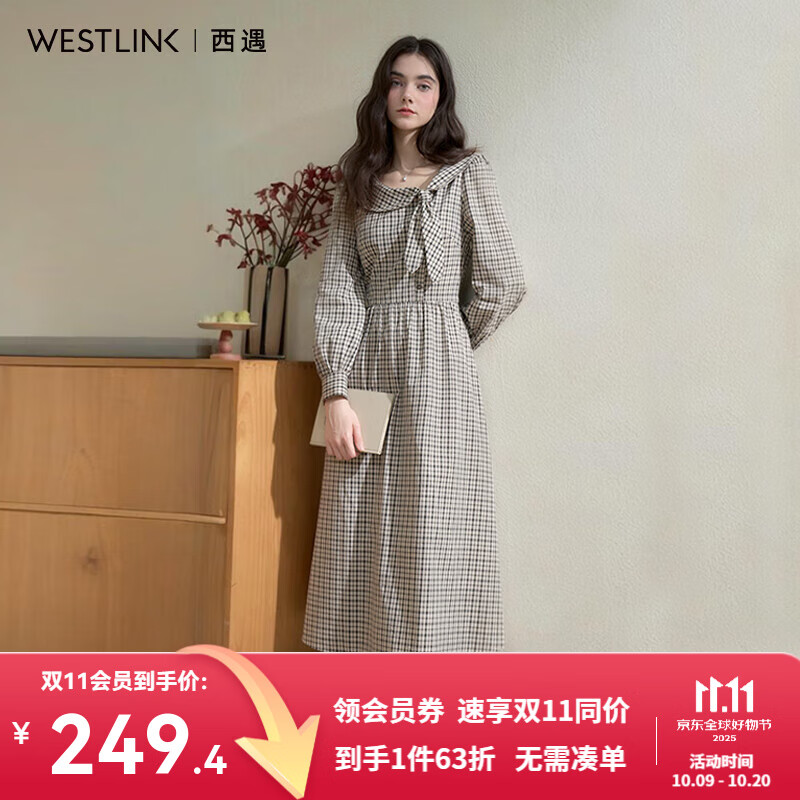 西遇复古减龄蝴蝶结系带格纹连衣裙女2025秋季高腰显瘦长袖长裙 杏色 L (165)