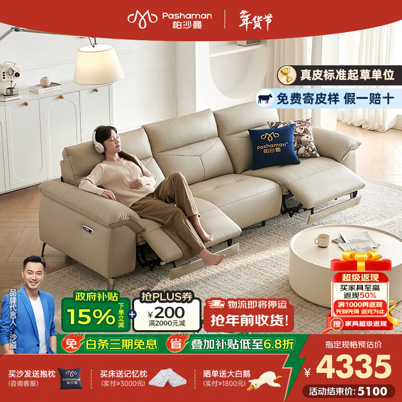 帕沙曼新款云感腰背按摩沙发客厅现代简约头层牛皮靠背功能沙发GF513-C 坐感王【单电动】2.16米双人位 柔滑头层牛皮MX(高回弹无粉海绵)