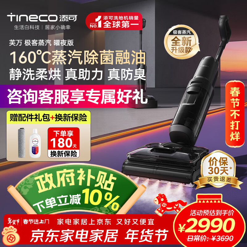 添可(TINECO)极客曜夜 蒸汽版 AI全向助力【160℃蒸汽除油污 90min续航】0缠毛躺平洗地机吸拖一体扫地机器人 【咨询再减】极客曜夜蒸汽版
