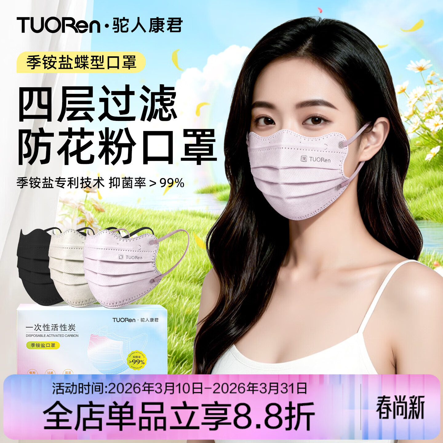 驼人康君驼人季铵盐活性炭口罩一次性2026新款春季防花粉尘甲醛孕妇可用 黑色【买1盒送1盒共60支】