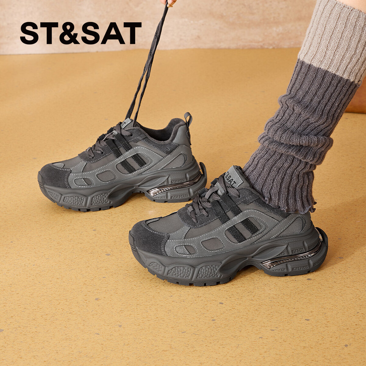 星期六冬季女鞋加绒厚底老爹鞋女款2025新款鞋子女百搭休闲运动鞋 灰色 35