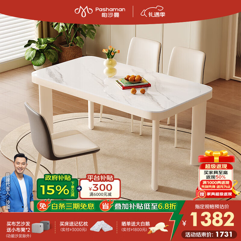 帕沙曼岩板餐桌椅组合现代简约小户型家用奶油风白色饭桌2026新款6082Y 【亮光雪花白·岩板餐桌】+6404Y餐椅*4 140cm *80cm*75cm