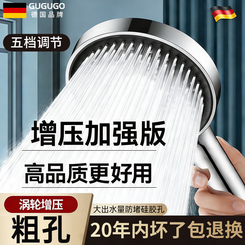 GuGuGo【德国】增压花洒喷头超强高压大出水浴室花洒淋浴喷头带软管一套 升级五档|粗孔大出水|增压单喷头 升级硅胶大面板丨五星级酒店同款