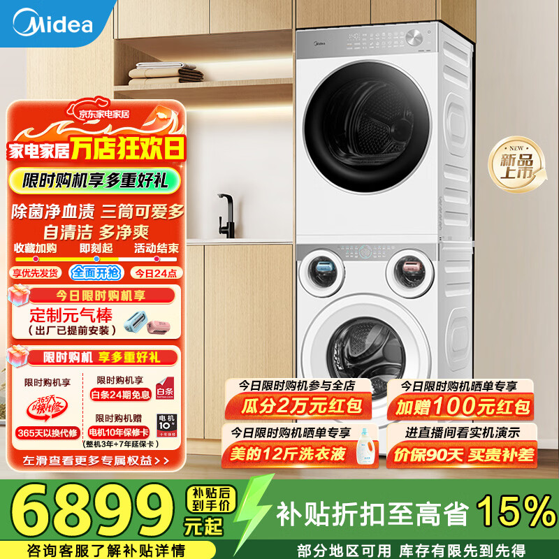 美的(Midea)可爱多分区洗烘套装全自动11kg滚筒+10kg热泵烘干机 全变频三筒智能投放除菌除螨智能判干 MG11GGEX+MH10L1PRO