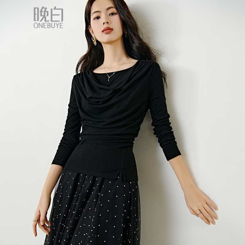 晚白【新品】2026年春款时尚堆堆领上衣亲肤柔软修身舒适T恤衫女 黑色 S