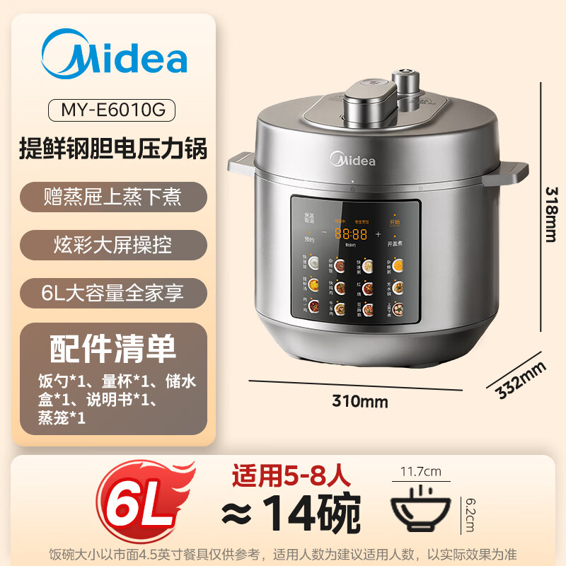 美的(Midea)【京东自营】0涂层 健康煮 6L大容量 全自动家用电压力锅高压锅煮小米饭锅MY-E6010G适用6-8人