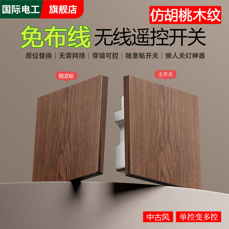 国际电工胡桃木纹智能无线遥控开关子母远程控制器免布线家用照明灯双控 胡桃木纹 一开套装【主开关*1+随意贴*1】