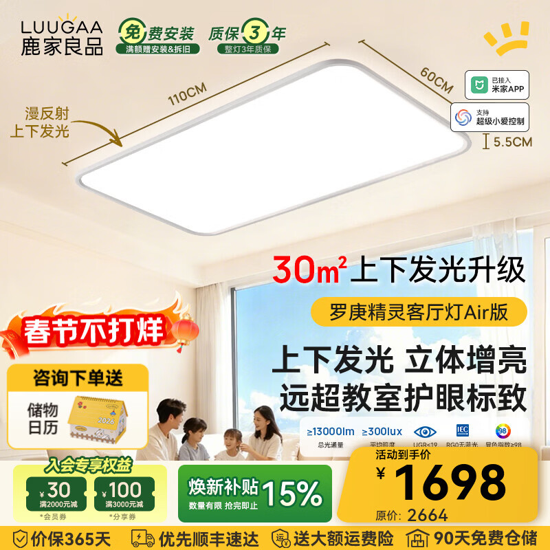 鹿家良品(LUUGAA)罗庚精灵全光谱护眼客厅吸顶灯简约现代客厅灯大灯漫反射母婴灯 上下发光护眼110cm无极光215W智能联动
