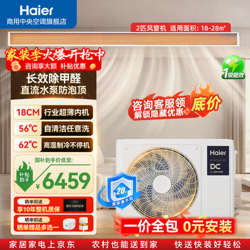 海尔云舒领航3匹风管机一拖一新房除甲醛 中央空调新一级能效嵌入式标配水泵防漏水 领航 云舒 2匹 领航直流水泵+长效除醛