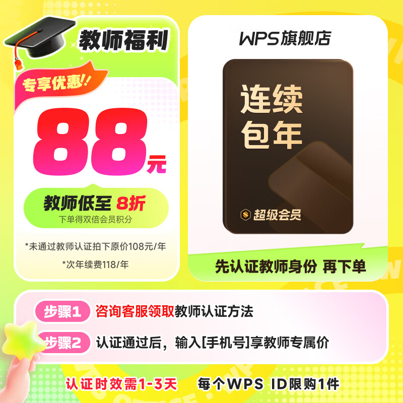 【教师价88元/年】WPS超级会员年卡-连续包年 含200+会员特权 PDF编辑与格式转换 含PPT模板资源 限购1件 输入手机号校验身份直充到账 【教师价88元/年】WPS超级会员连续包年