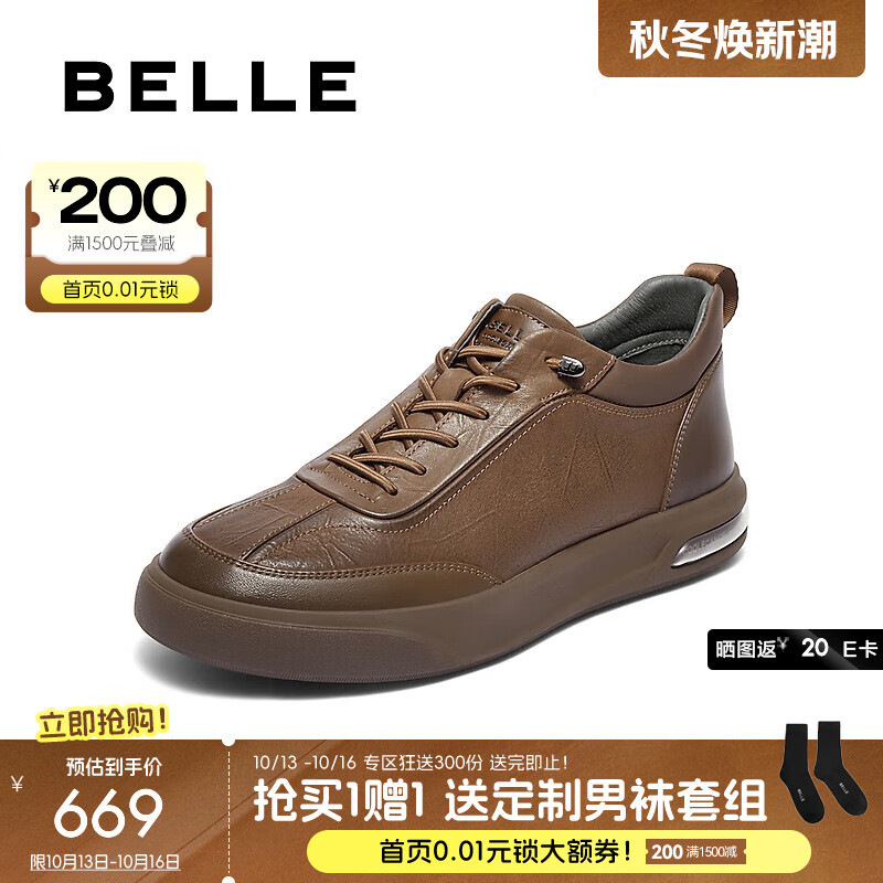 百丽(Belle)男鞋高帮板鞋2025冬季新款商场同款真皮厚底休闲鞋加绒8WB01DM5 棕色-单里 40 (250mm)