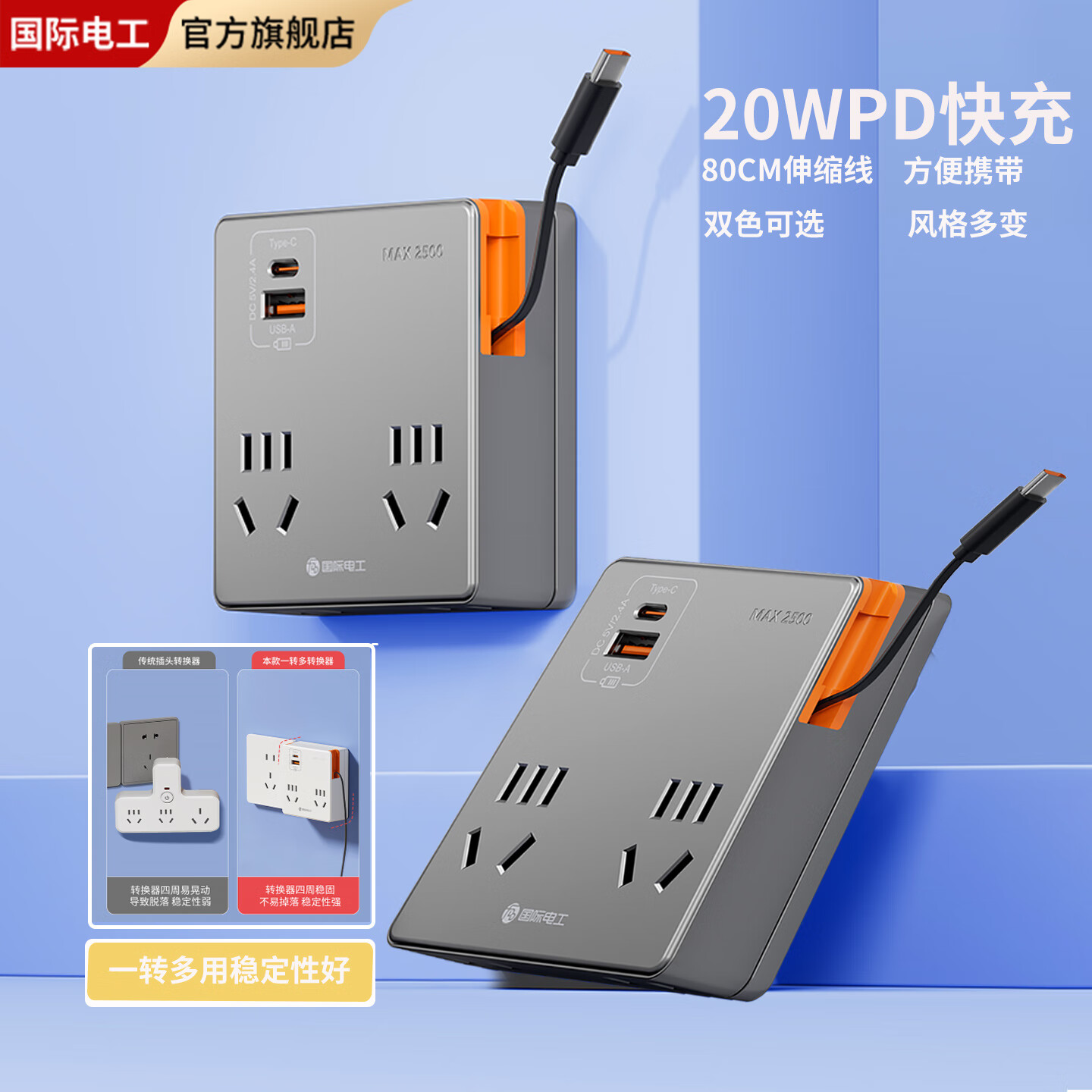 FDD国际电工20W快充带伸缩线86型直插转换器插座多功能一转四插板二合一接口 带C伸缩线一转四【A+C】灰色