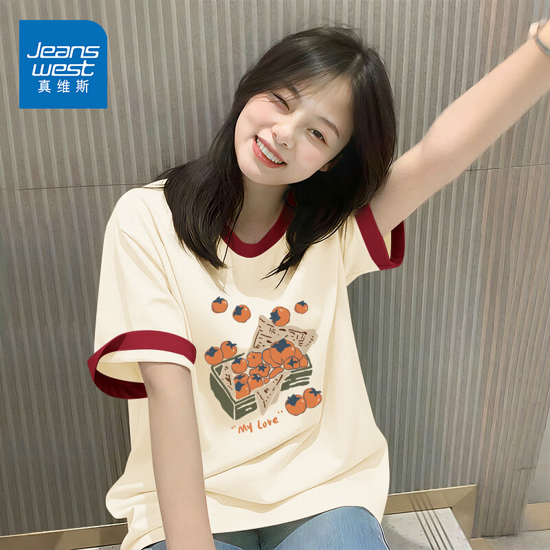 真维斯(Jeanswest)撞色纯棉短袖t恤女2026年夏季新款设计感正肩半袖时尚多巴胺上衣 米砖红 一筐柿子 S