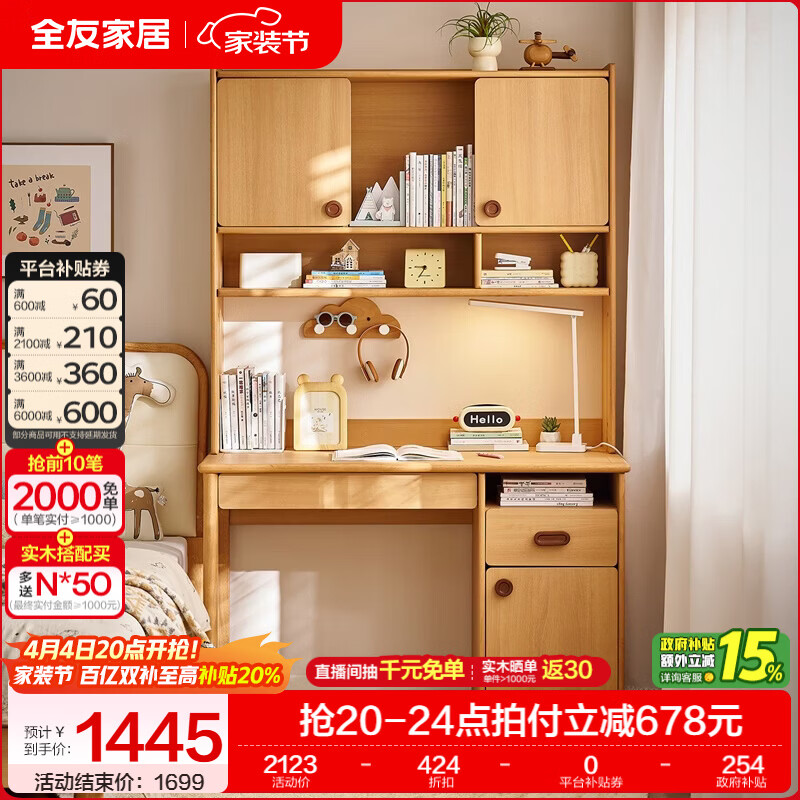 全友家居原木风儿童学习桌2026新款书桌书架一体带抽屉家用学生写字桌 【原木风】1.2米儿童书桌架