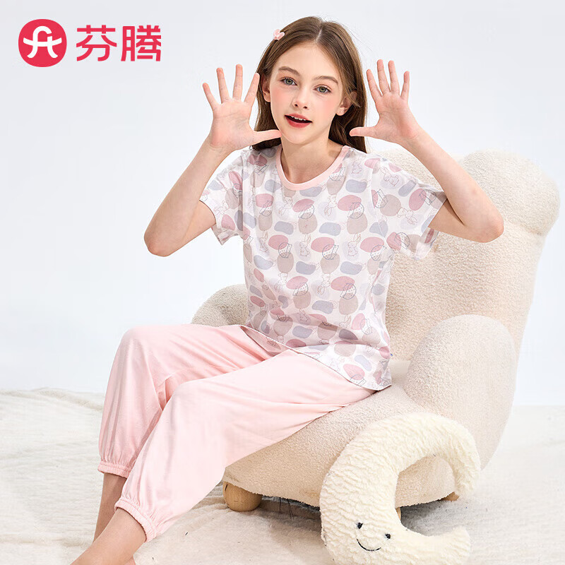 芬腾睡衣男童【纯棉】2025舒适圆领柔软透气可外穿短袖家居服套装 粉色款式2-女童 120