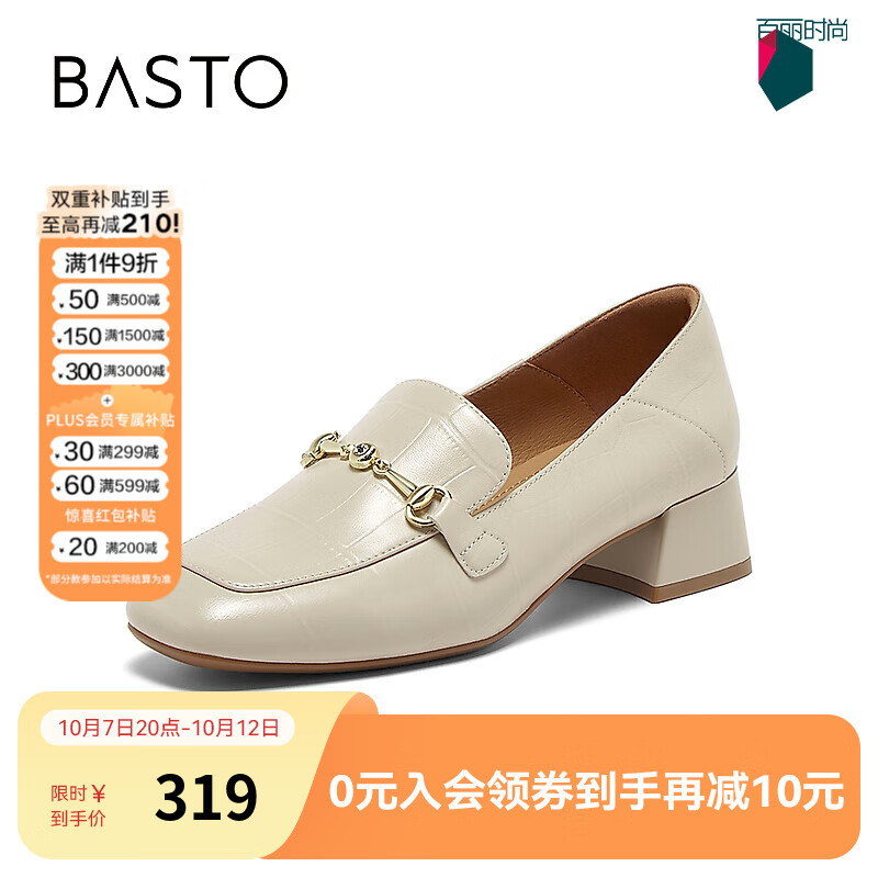 百思图2025秋新款复古羊皮乐福鞋皮鞋通勤粗跟方头女单鞋TL527CA5 米色 36