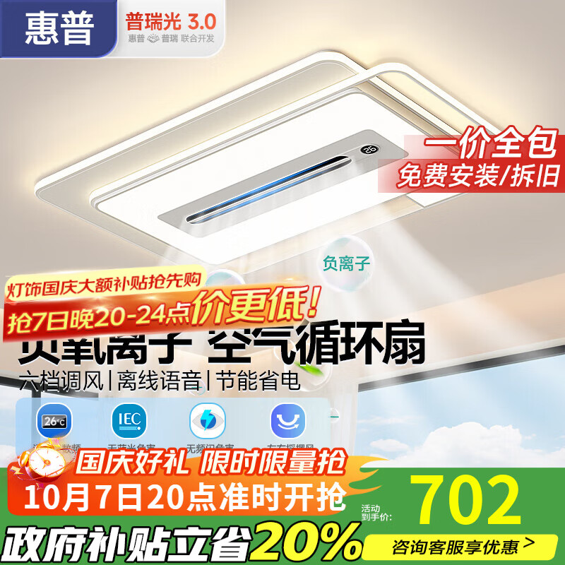 惠普普瑞护眼led吸顶灯无叶风扇灯2025新款客厅卧室语音智能中山灯具 200W 35㎡内适用 -110cm-离线语音