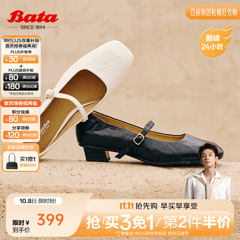 Bata玛丽珍女2025秋商场新款羊皮法式通勤百搭粗跟浅口鞋63191CQ5 米白 38