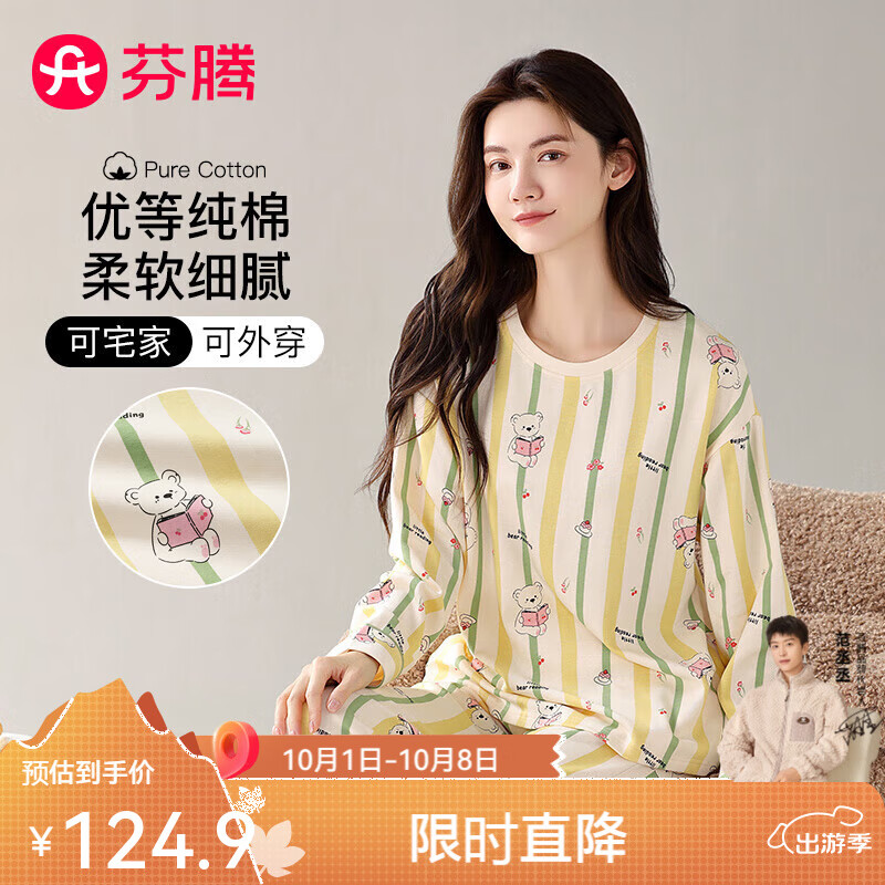芬腾睡衣女【棉可外穿】加固圆领条纹小熊长袖家居服套装 杏色 M
